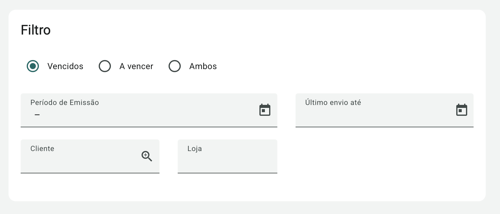 A seção Filtro permite definir quais títulos a receber serão considerados no envio dos e-mails.