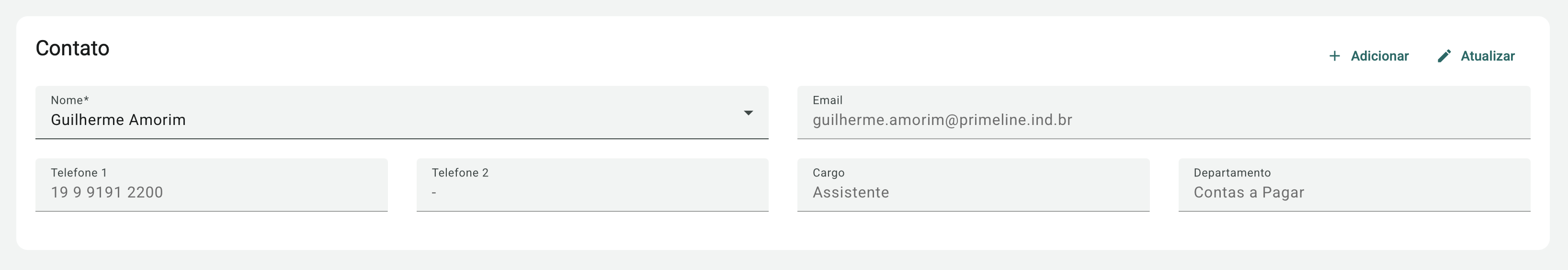 O painel Contato define a pessoa que receberá o contato referente ao acompanhamento. O módulo permite vincular múltiplos contatos a um mesmo cliente.