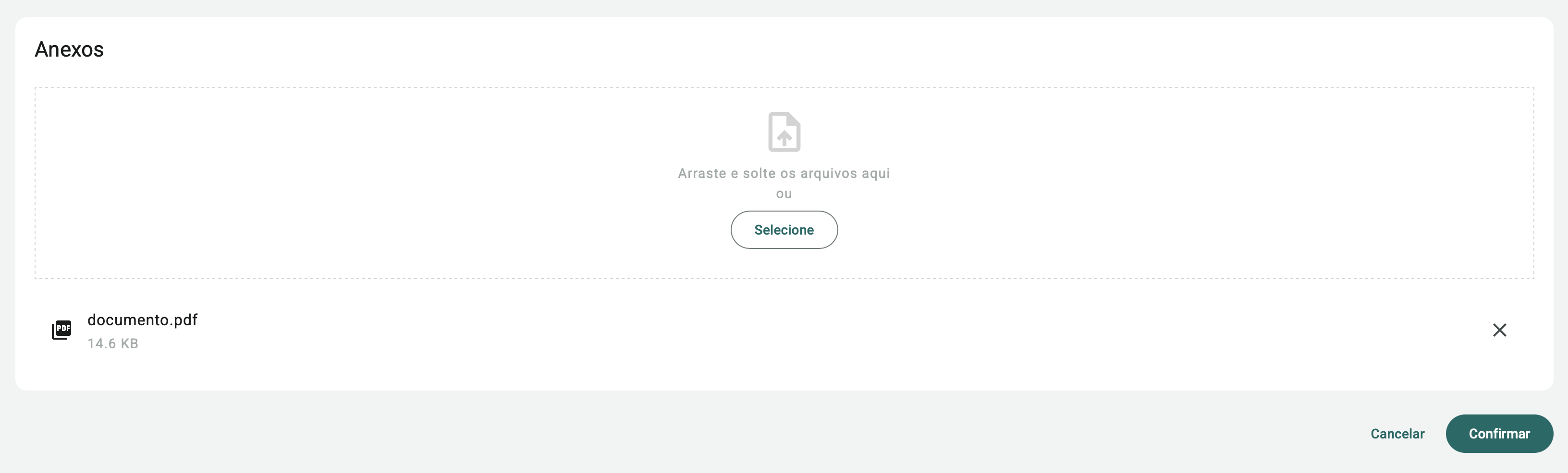- Anexo de Documentos — inclusão de arquivos como comprovantes de pagamento, acordos ou documentos cadastrais