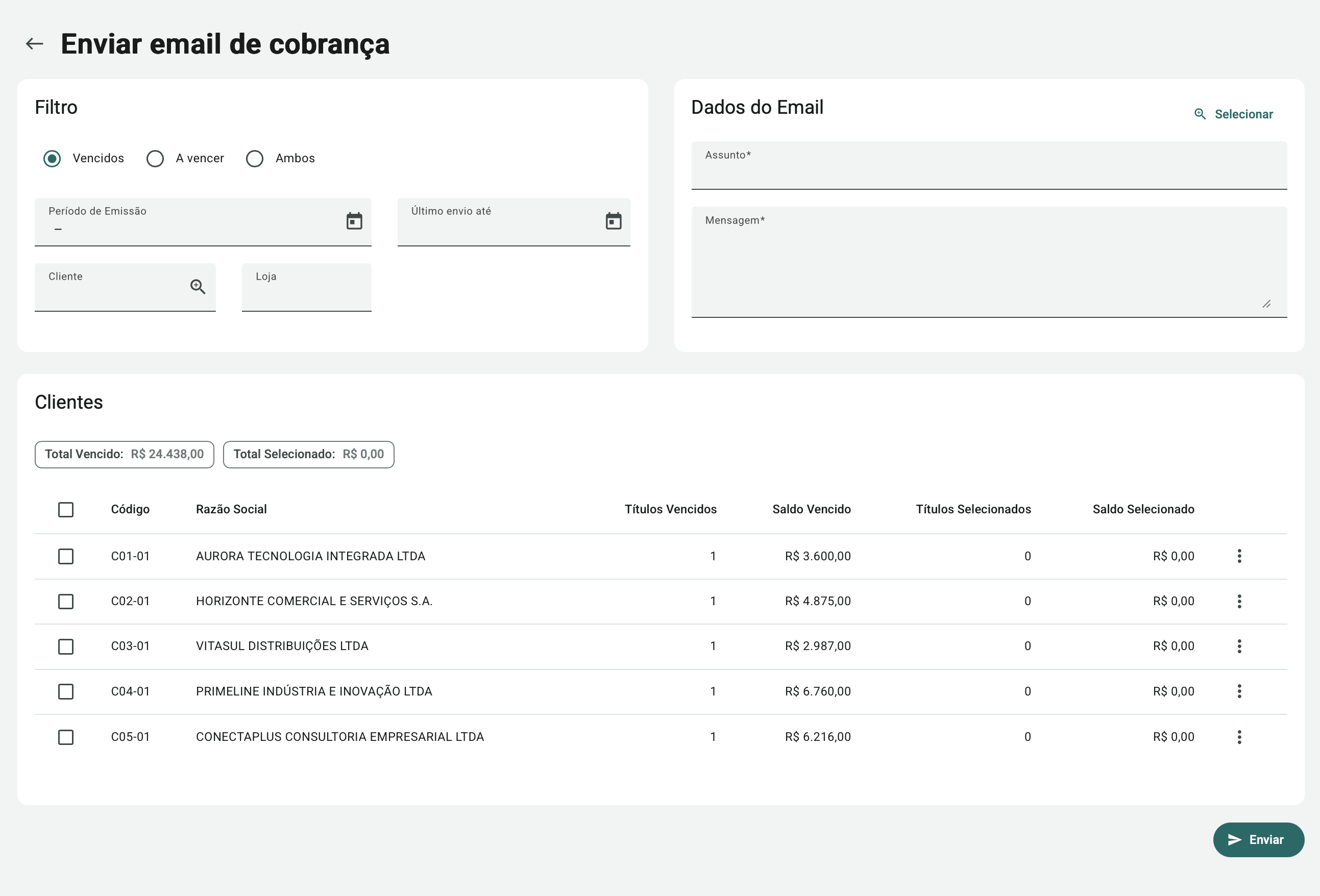 Além de selecionar os clientes, o sistema permite definir exatamente quais títulos serão incluídos no envio. Para isso, utilize a opção Selecionar Títulos, disponível no botão localizado à direita de cada cliente no grid.