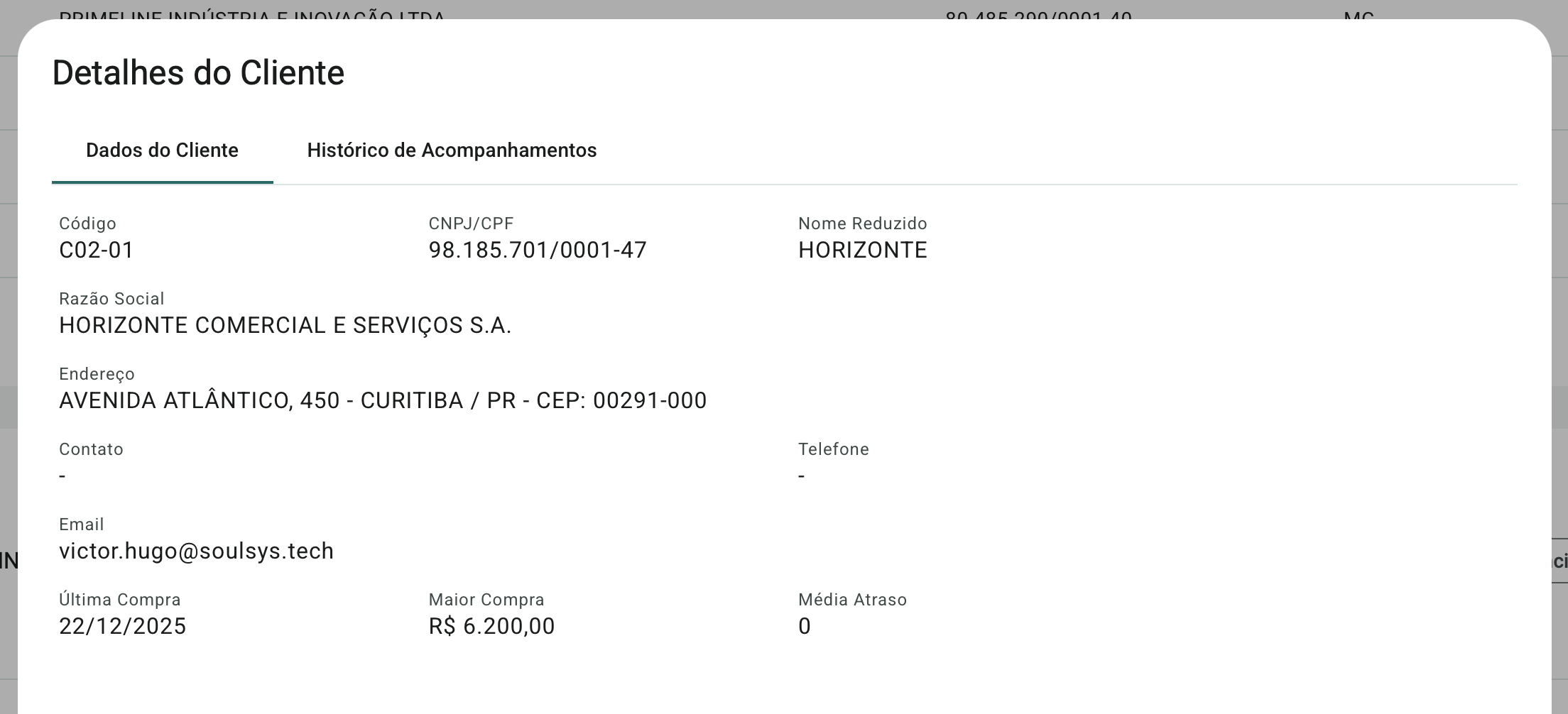 Na aba Histórico de Acompanhamentos, é possível visualizar todos os acompanhamentos já registrados para aquele cliente, proporcionando uma visão completa do histórico de cobranças.