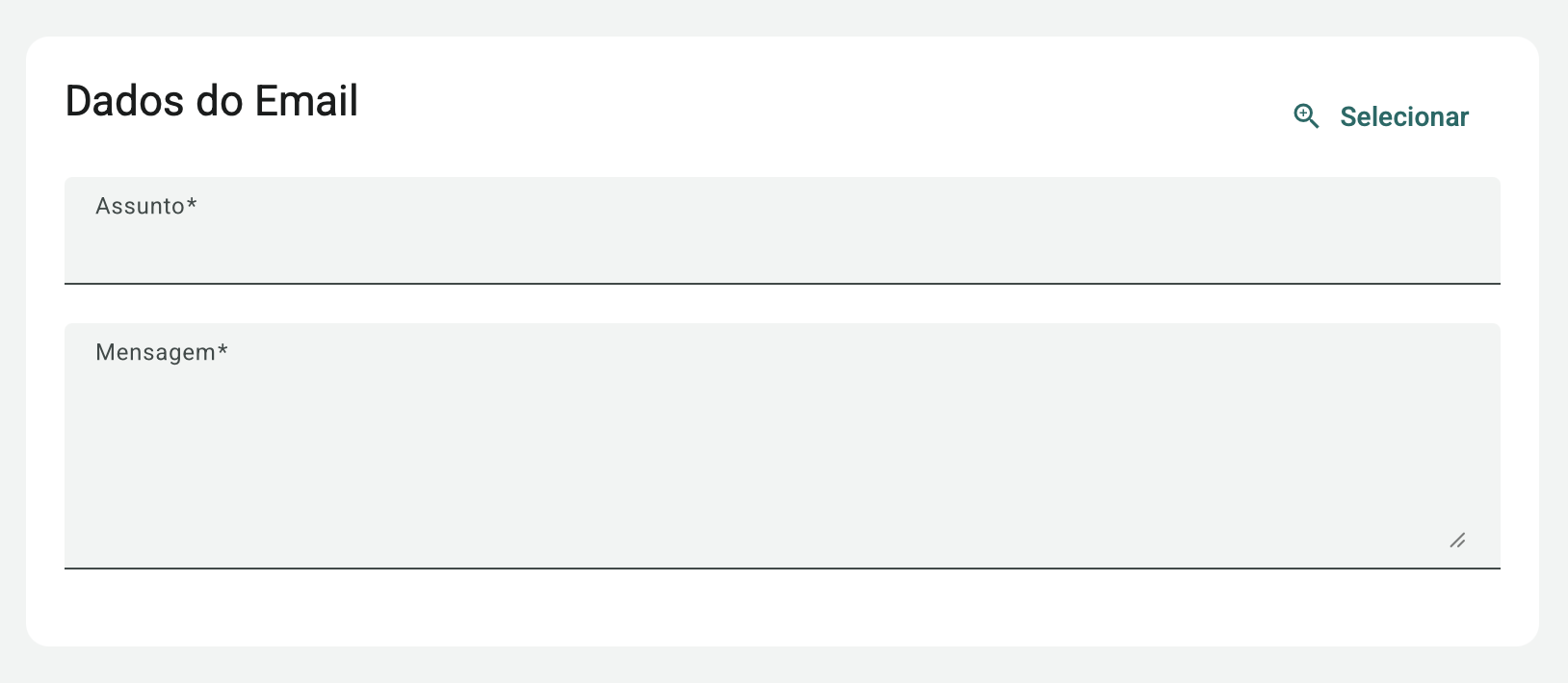 Por meio do botão Selecionar, localizado no canto superior direito do card Dados do E-mail, é possível escolher modelos de e-mail previamente cadastrados, agilizando o processo de envio e garantindo padronização na comunicação.
