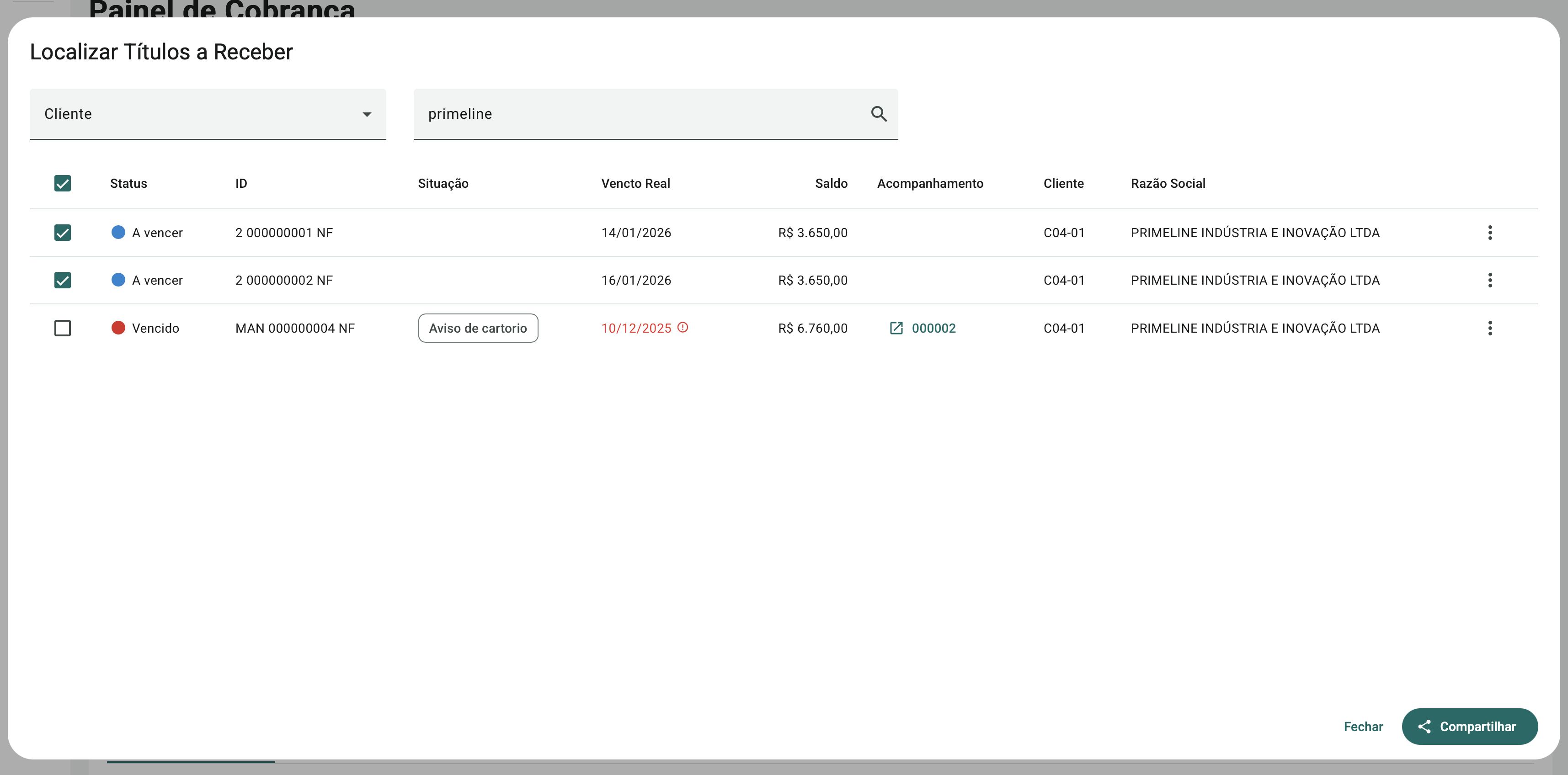 Ao selecionar um ou mais títulos, o sistema habilita o botão Compartilhar, localizado no canto superior direito da seção Títulos a Receber. Essa funcionalidade permite compartilhar boletos bancários ou notas fiscais relacionadas aos títulos do acompanhamento.