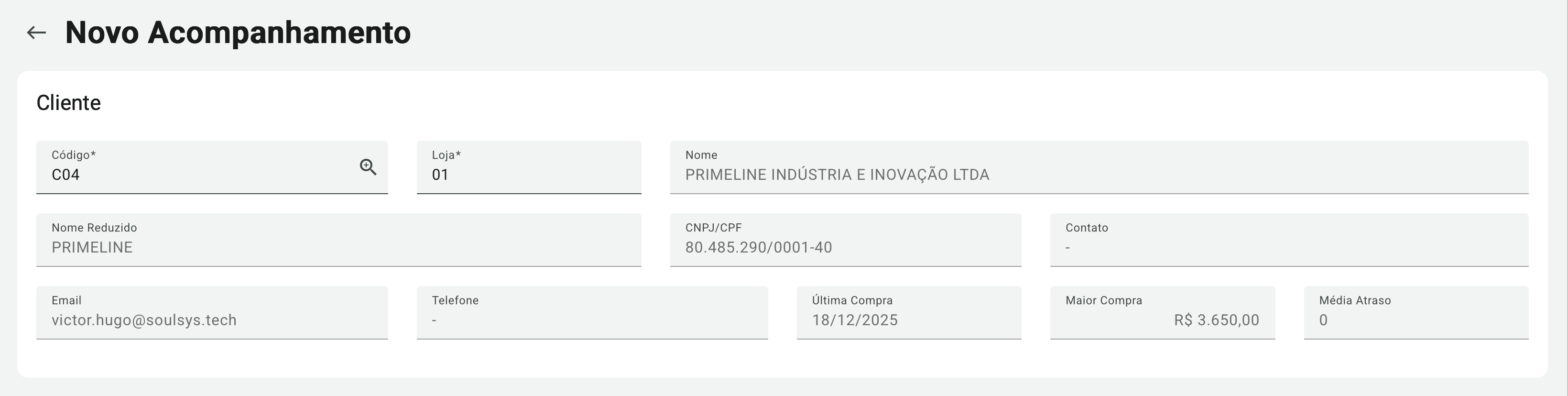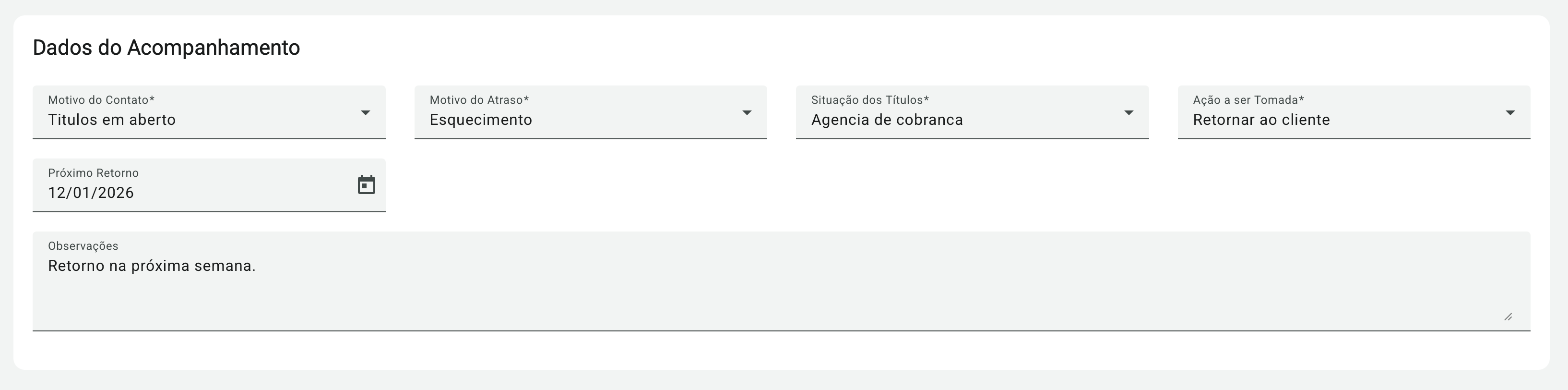 - Novo Acompanhamento — inicia a criação de um novo acompanhamento para o cliente e os títulos selecionados.