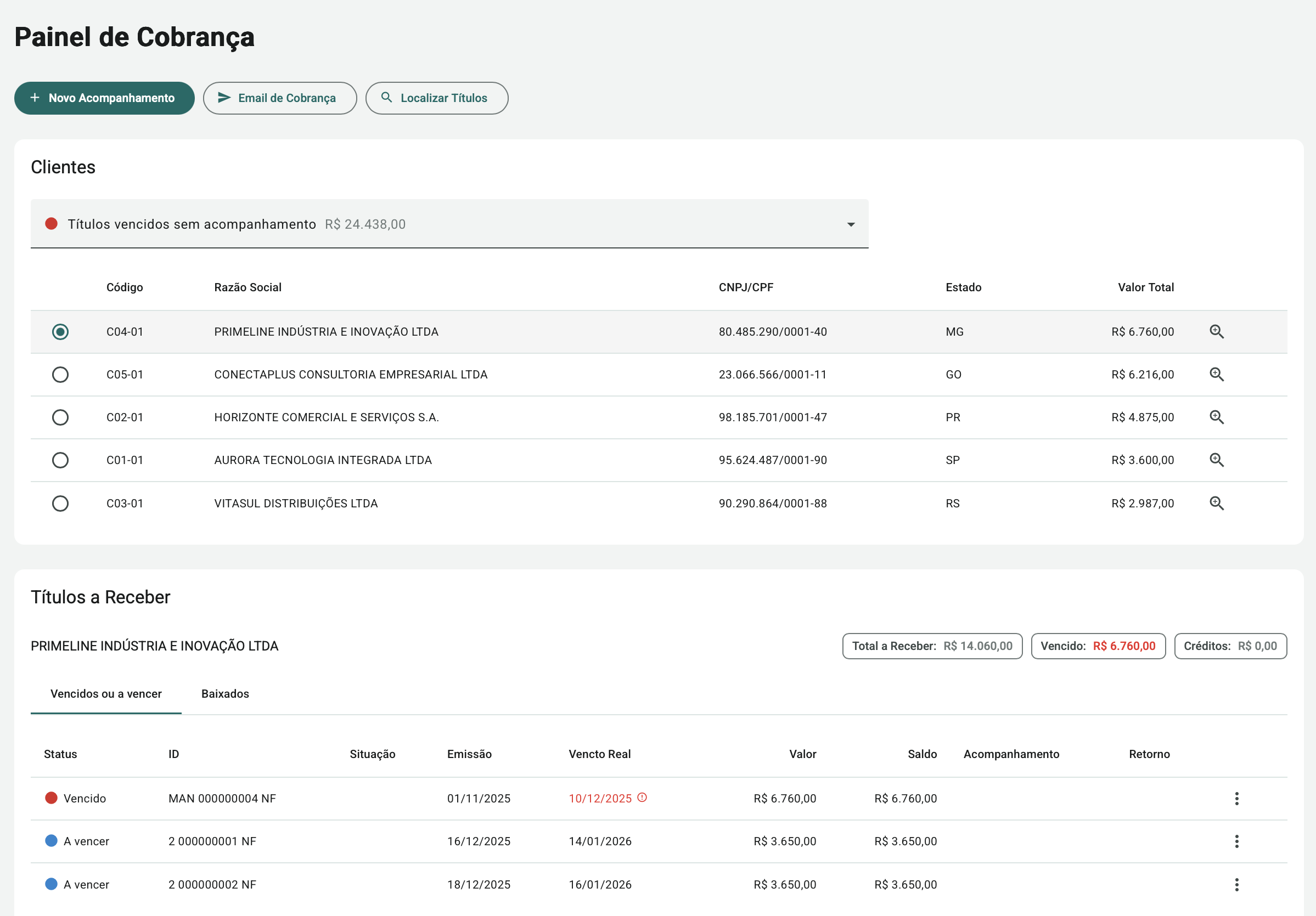 A partir de um painel de gestão, os operadores conseguem localizar rapidamente os títulos a receber, registrar acompanhamentos vinculados aos títulos, anexar documentos e realizar o envio de e-mails de cobrança, tudo em um único ambiente.