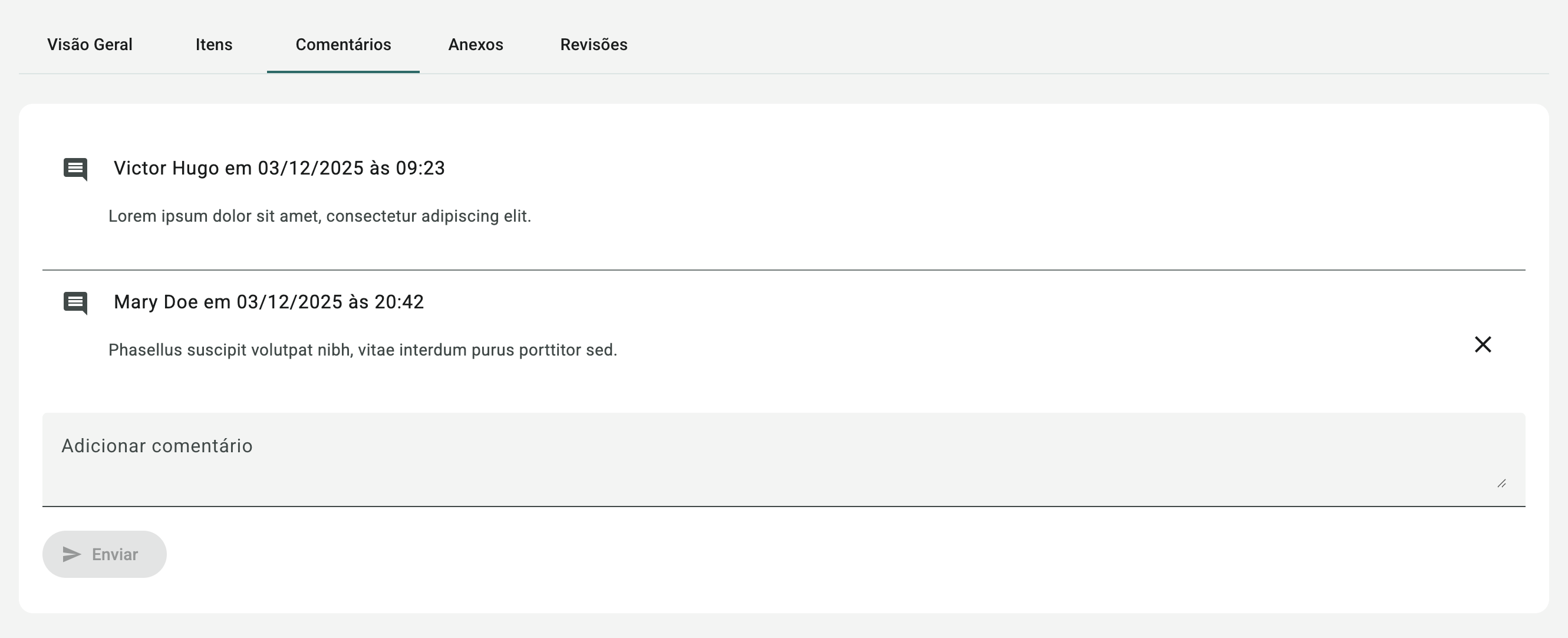 A aba Comentários permite que o responsável e os aprovadores troquem mensagens diretamente pela plataforma, garantindo mais clareza, rastreabilidade e transparência na comunicação sobre a venda.