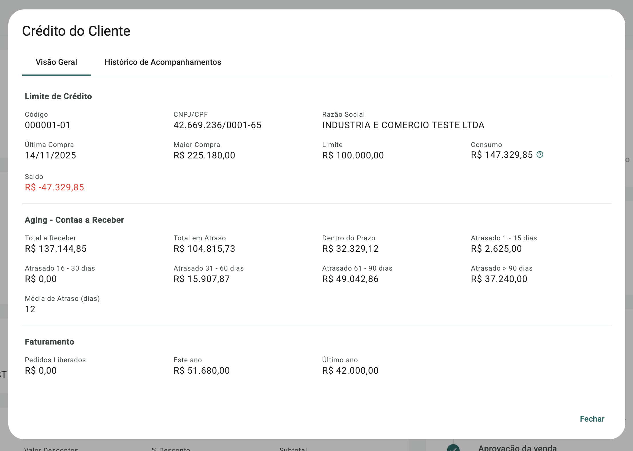 Para auxiliar na tomada de decisão, os aprovadores podem acessar a tela de Análise de Crédito do Cliente. Essa funcionalidade é acionada pelo botão Crédito, localizado no canto superior direito do card Cliente.