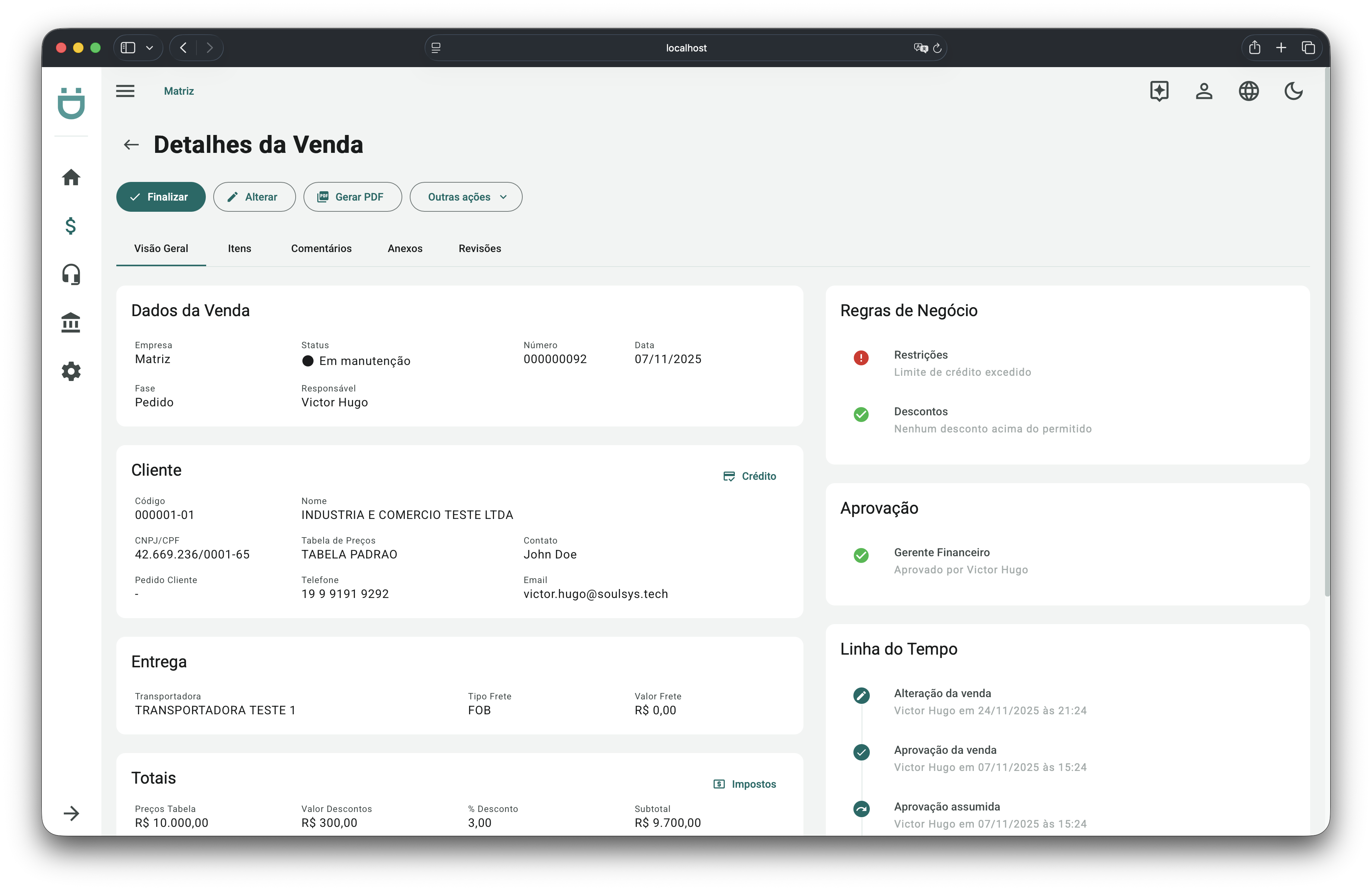 Consulte a documentação técnica do módulo de vendas para obter detalhes adicionais sobre integrações, pontos de entrada e recursos avançados.