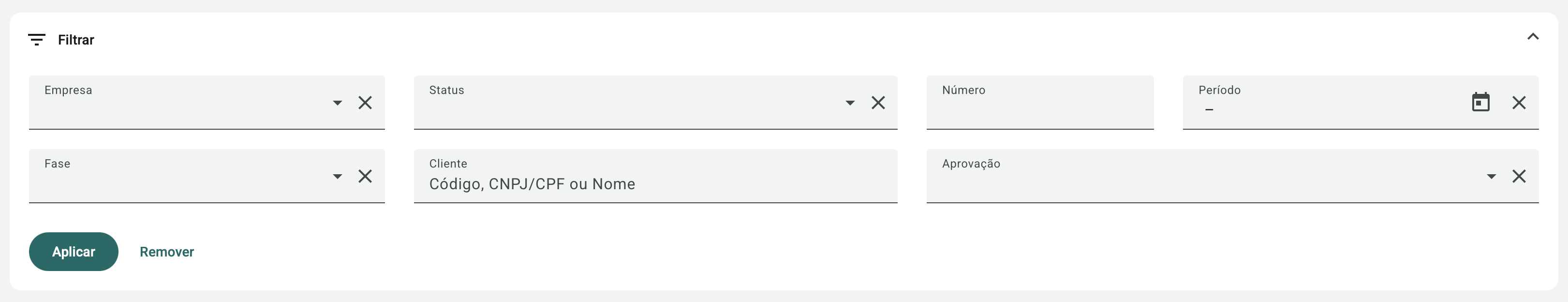 A página de gestão das vendas permite localizar rapidamente qualquer orçamento ou pedido por meio da seção Filtrar.
