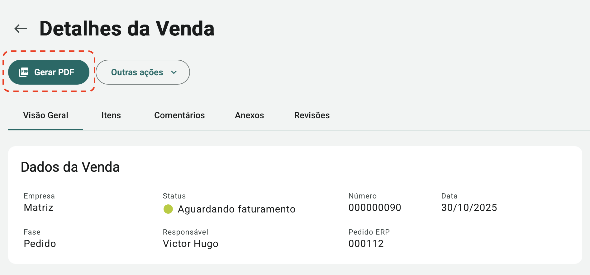 Aprovar — aprova a venda, que passa para o status Aguardando confirmação do responsável.