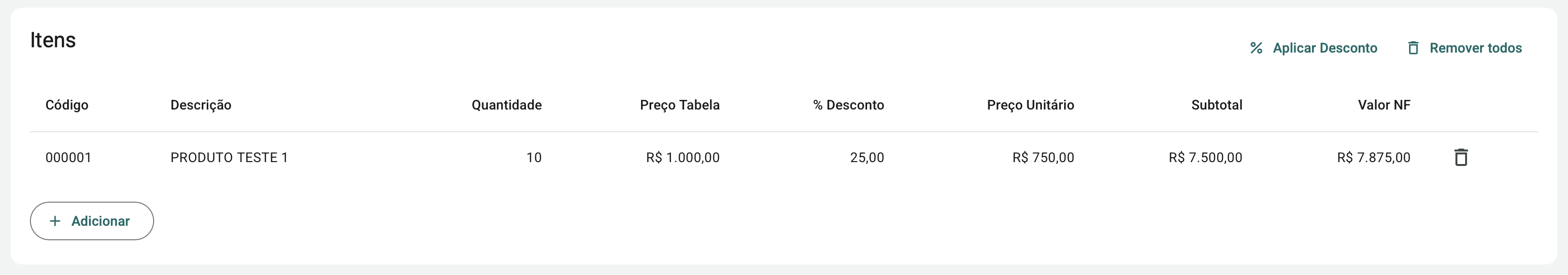 A seção Itens controla todos os produtos e serviços incluídos na venda.