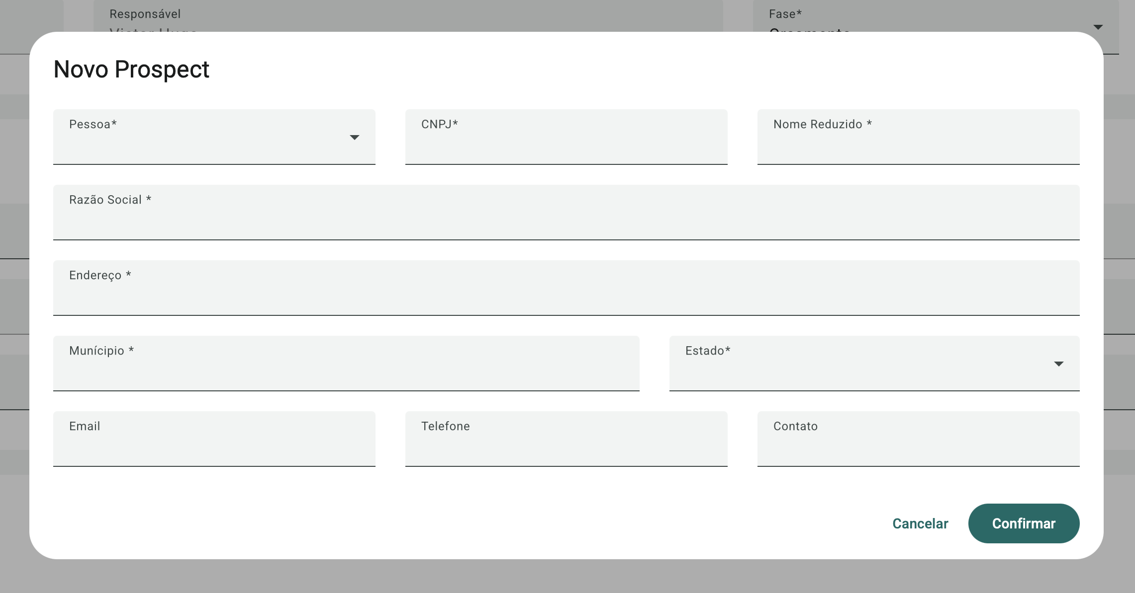 Quando a fase da venda é definida como Orçamento, o sistema habilita o botão Cadastrar na seção Cliente. Ao clicar nesse botão, será exibido um formulário para criação de um Novo Prospect.
