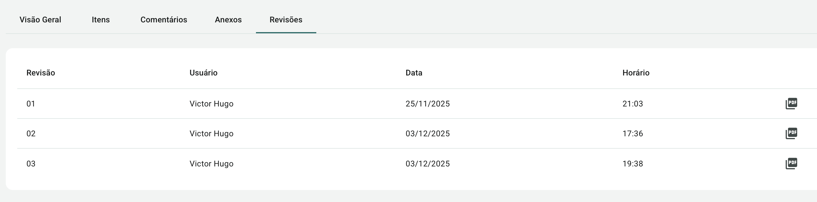 A seção Revisões permite consultar todas as versões da venda, desde a criação até a mais recente.