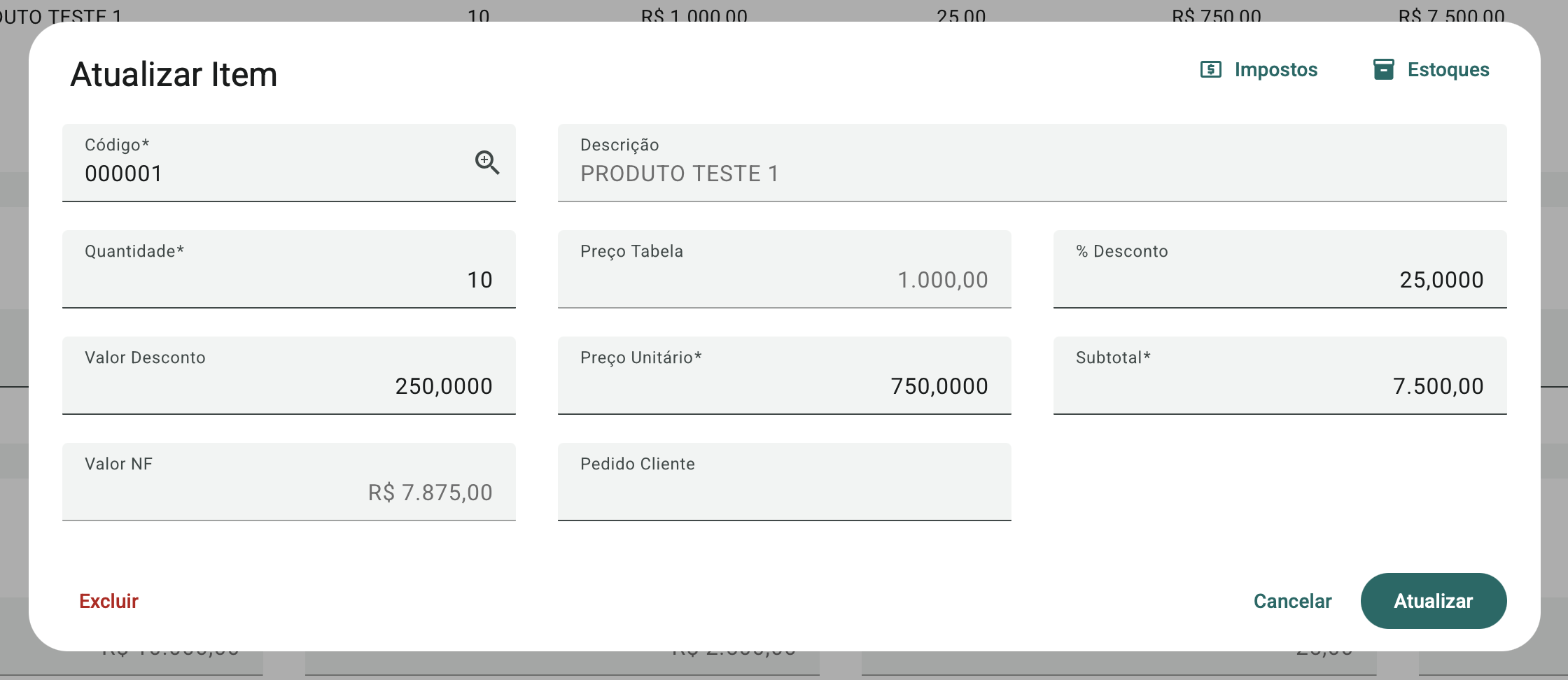O cálculo dos impostos dos itens é realizado em tempo real.