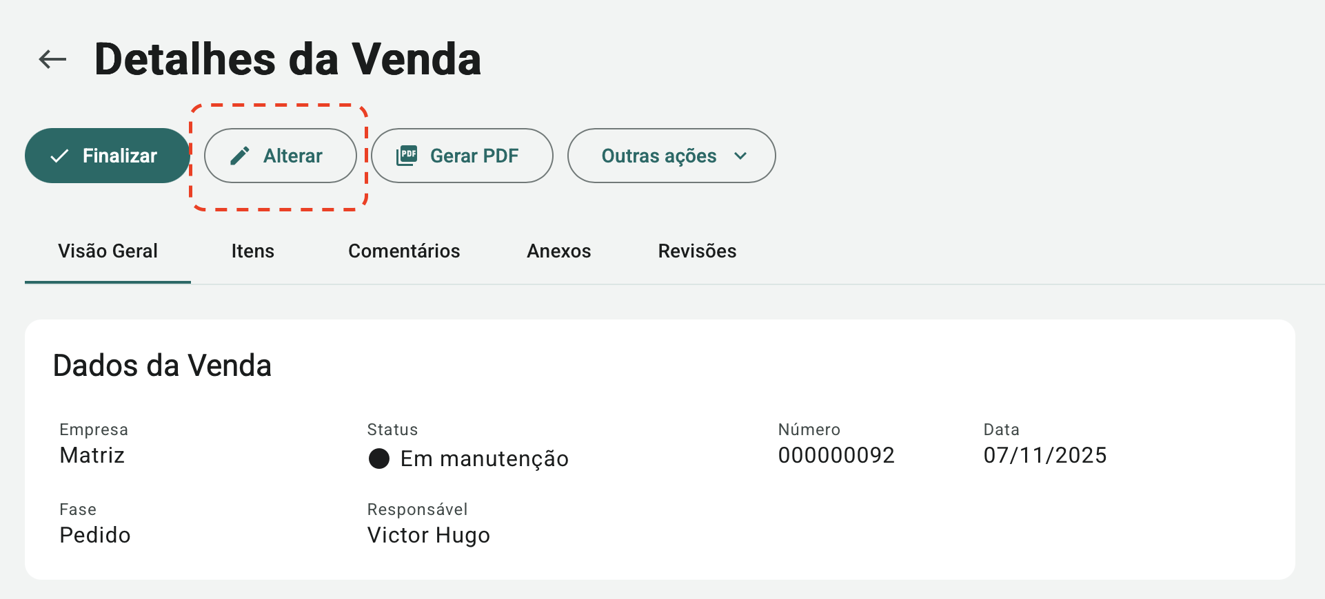Diversas ações podem ser executadas a partir de uma venda. As opções disponíveis variam conforme o status da venda e o perfil do usuário logado.